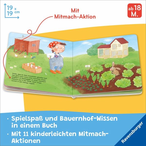 Auf dem Bauernhof gibt es immer etwas zu tun: Wer fährt mit dem Traktor? Wer hilft beim Melken der Kühe? Und wer sammelt die Eier ein? Durch Klatschen, Streicheln, Schütteln und andere, kinderleichte Mitmach-Aktionen werden Kinder ab 18 Monaten in diesem Spielbuch selbst aktiv und helfen Bäuerin Lina bei ihrer Arbeit. Das macht Spaß! Und ganz nebenbei erfahren Kleinkinder auch viele spannende Dinge über die Tiere und Fahrzeuge auf dem Bauernhof.