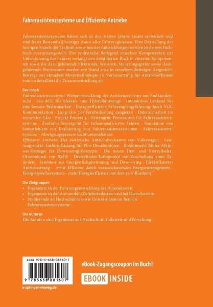 Fahrerassistenzsysteme haben sich in den letzten Jahren rasant entwickelt und sind fester Bestandteil heutiger Autos aller Fahrzeugklassen. Eine Darstellung des heutigen Stands der Technik sowie neuster Entwicklungen werden in diesem Fachbuch zusammengestellt. Der realistische Reifegrad einzelner Komponenten zur Unterstützung des Fahrers verlangt den detaillierten Blick in einzelne Komponenten sowie die dazu gehörende Elektronik. Sensoren, Steuerungsgeräte sowie dazugehörende Prozessoren werden mit Stand 2014 in einzelnen Beiträgen dargestellt. Beiträge zur aktuellen Motortechnologie als Voraussetzung für Antriebseffizienz runden detailliert die Zusammenstellung ab.
