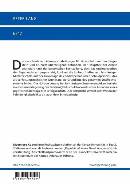 Die verschiedenen Konzepte fahrlässiger Mittäterschaft werden dargestellt und als nicht überzeugend befunden. Der Hauptteil der Arbeit analysiert nach der kursorischen Feststellung, dass das Analogieverbot der Figur nicht entgegensteht, konkret die Unbegründbarkeit fahrlässiger Mittäterschaft auf der Grundlage des höchstpersönlichen Schuldprinzips, das als verfassungsrechtlicher Grundsatz die Grundlage des gesamten Strafrechtssystems bildet. Die richtige Lösung bei fahrlässigem Zusammenwirken besteht in einer Vorverlagerung des Fahrlässigkeitsschuldvorwurfs unter Annahme eines psychischen Beitrags zum Erfolgseintritt. Dies entspricht sowohl dem Wesen der Fahrlässigkeitsdelikte als auch dem Schuldprinzip.