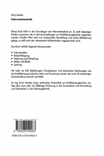 Ein Fachbuch mit vielen Bildern und Tafeln, das sich an einen breiten am Kraftfahrzeug interessierten Leserkreis wendet. Auf den Gebieten der Darstellung der Reifenschräglaufeigenschaften, der Bewertung der Elastokinematik der Radaufhängungen und der Wirkung von Schraubenfedern auf ihre Auflage geht es über den bisher in Fachbüchern veröffentlichten Stand hinaus. Eine Informationsquelle zum kurzen Nachschlagen, aber auch zum tiefgehenden Studium.