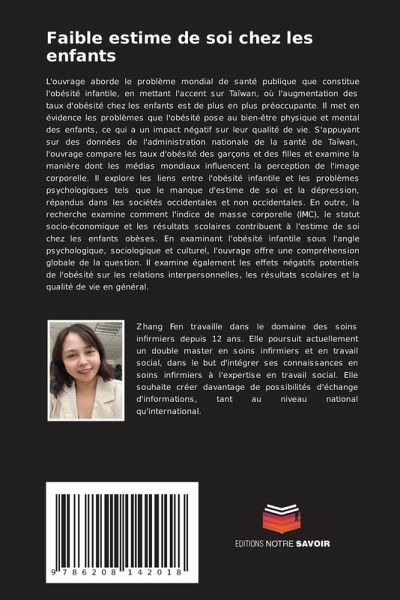 L'ouvrage aborde le problème mondial de santé publique que constitue l'obésité infantile, en mettant l'accent sur Taïwan, où l'augmentation des taux d'obésité chez les enfants est de plus en plus préoccupante. Il met en évidence les problèmes que l'obésité pose au bien-être physique et mental des enfants, ce qui a un impact négatif sur leur qualité de vie. S'appuyant sur des données de l'administration nationale de la santé de Taïwan, l'ouvrage compare les taux d'obésité des garçons et des filles et examine la manière dont les médias mondiaux influencent la perception de l'image corporelle. Il explore les liens entre l'obésité infantile et les problèmes psychologiques tels que le manque d'estime de soi et la dépression, répandus dans les sociétés occidentales et non occidentales. En outre, la recherche examine comment l'indice de masse corporelle (IMC), le statut socio-économique et les résultats scolaires contribuent à l'estime de soi chez les enfants obèses. En examinant l'obésité infantile sous l'angle psychologique, sociologique et culturel, l'ouvrage offre une compréhension globale de la question. Il examine également les effets négatifs potentiels de l'obésité sur les relations interpersonnelles, les résultats scolaires et la qualité de vie en général.