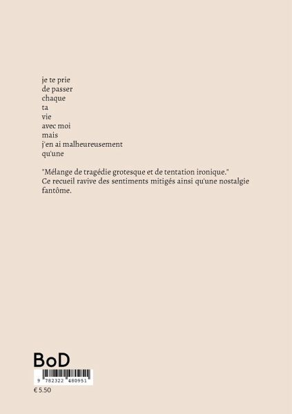 je te prie de passer chaque ta vie avec moi mais j'en ai malheureusement qu'une"Mélange de tragédie grotesque et de tentation ironique."Ce recueil ravive des sentiments mitigés ainsi qu'une nostalgie fantôme.