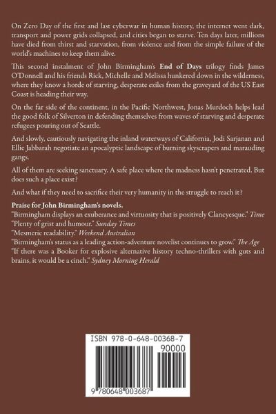 On Zero Day of the first and last cyberwar in human history, the internet went dark, transport and power grids collapsed, and cities began to starve. Ten days later, millions have died from thirst and starvation, from violence and from the simple failure of the world's machines to keep them alive. This second instalment of John Birmingham's End of Days trilogy finds James O'Donnell and his friends Rick, Michelle and Melissa hunkered down in the wilderness, where they know a horde of starving, desperate exiles from the graveyard of the US East Coast is heading their way. On the far side of the continent, in the Pacific Northwest, Jonas Murdoch helps lead the good folk of Silverton in defending themselves from waves of starving and desperate refugees pouring out of Seattle. And slowly, cautiously navigating the inland waterways of California, Jodi Sarjanan and Ellie Jabbarah negotiate an apocalyptic landscape of burning skyscrapers and marauding gangs. All of them are seeking sanctuary. A safe place where the madness hasn't penetrated. But does such a place exist? And what if they need to sacrifice their very humanity in the struggle to reach it? Praise for John Birmingham's novels. "Birmingham displays an exuberance and virtuosity that is positively Clancyesque." Time "Plenty of grist and humour." Sunday Times "Mesmeric readability." Weekend Australian "Birmingham's status as a leading action-adventure novelist continues to grow." The Age "If there was a Booker for explosive alternative history techno-thrillers with guts and brains, it would be a cinch." Sydney Morning Herald