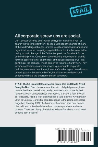 #FAIL: The 50 Greatest Social Media Screw-Ups and How to Avoid Being the Next One chronicles another kind of digital pioneer, those brands that have made iconic, early stumbles in social media that have resulted in consequences well beyond a loss of a few "friends" or "followers." From a lock-picking geek's take-down of Kryptonite in 2004 to Carnival Corp's tin-eared response to the Costa Concordia tragedy in January, 2012, the blunders chronicled here cost companies millions, bruised well-honed corporate reputations and sunk careers. This book chronicles the mistakes and provides a road map to help you and your company learn from those mistakes to make sure you don't become the next Social Media Screw-Up!