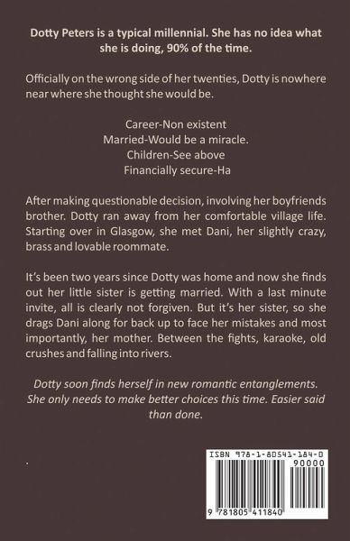 Dotty Peters is a typical millennial. She has no idea what she is doing 90% of the time. Officially on the wrong side of her twenties, Dotty is nowhere near where she thought she would be. Career - Non-existent Married - Would be a miracle Children - See above Financially secure - Ha After making a questionable decision involving her boyfriend's brother, Dotty ran away from her comfortable village life. Starting over in Glasgow, she met Dani, her slightly crazy, brassy and lovable roommate. It's been two years since Dotty was last home, and now she finds out her little sister is getting married. With a last-minute invite, all is clearly not forgiven. But it's her sister, so she drags Dani along for backup to face her mistakes and, most importantly, her mother. Between the fights, karaoke, old crushes and falling into rivers, Dotty soon finds herself in new romantic entanglements. She only needs to make better choices this time. Easier said than done.