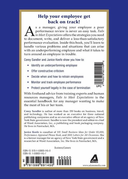 Help your employee get back on track! Fails to Meet Expectations offers the strategies you need to handle various problems and situations that can arise with an underperforming employee and what it takes to turn around an employee in trouble. As a manager, giving your employee a poor performance review is never an easy task. Fails to Meet Expectations offers the strategies you need to document, write, and deliver a less-than-satisfactory performance evaluation. Corey Sandler and Janice Keefe show you how to: • Identify an underperforming employee • Offer constructive criticism • Decide when and how to retrain employees • Monitor and track employee performance • Protect yourself legally in the case of termination With firsthand advice from training experts and human resources managers, Fails to Meet Expectations is the essential handbook for any manager wanting to make the most of his or her team.