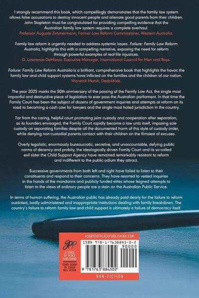 The year 2025 marks the 50th anniversary of the passing of the Family Law Act, the single most intrusive and destructive piece of legislation to ever pass the Australian parliament. In that time the Family Court has been the subject of dozens of government inquiries and attempts at reform on its road to becoming a cash cow for lawyers and the single most hated jurisdiction in the country. Far from the caring, helpful court promoting joint custody and cooperation after separation, as its founders envisaged, the Family Court rapidly became a law unto itself, imposing sole custody on separating families despite all the documented harm of this style of custody order, while denying non-custodial parents contact with their children on the flimsiest of excuses. Overly legalistic, enormously bureaucratic, secretive, and unaccountable, defying public norms of decency and probity, the ideologically driven Family Court and its so-called evil sister the Child Support Agency have remained remarkably resistant to reform and indifferent to the public odium they attract. Successive governments from both left and right have failed to listen to their constituents and respond to their concerns. They have resorted to vested inquiries in the hands of the mandarins and publicly funded elites whose feigned attempts to listen to the views of ordinary people are a stain on the Australian Public Service. In terms of human suffering, the Australian public has already paid dearly for the failure to fix outdated, badly administered and inappropriate institutions dealing with family breakdown. The country's failure to reform family law and child support is ultimately a failure of democracy itself.