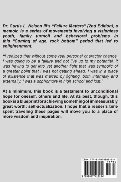 Dr. Curtis L. Nelson III's "Failure Matters," a memoir, is a series of movements involving a visionless youth and his family and struggles in this, "Coming of age rock bottom," period that led to enlightenment. I realized that without some real personal character change, I was going to be a failure and not live up to my potential. It was having to get into yet another fight that was symbolic of a greater point that I was not getting ahead. I was in a place of existence that was marred by fighting, both internally and externally. I was a sophomore in high school and lost. At a minimum, this book is a testament to unconditional hope for oneself, others and life. At its best, though, this book is a blueprint for achieving something of immeasurably great worth: self-actualization. I hope that a reader's time spent traveling these pages will move you to a place of more wisdom and inspiration.