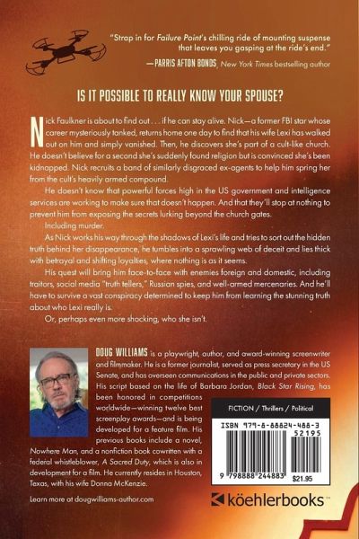 "Intense, compelling, and relentless . . . will keep you turning the pages until the very last one." -Mike McGrale, screenwriter, The Following, CSI: Miami "Strap in for Failure Point's chilling ride of mounting suspense that leaves you gasping at the ride's end." -Parris Afton Bonds, New York Times bestselling author Is it possible to really know your spouse? Nick Faulkner is about to find out . . . if he can stay alive. Nick-a former FBI star whose career mysteriously tanked, returns home one day to find that his wife Lexi has walked out on him and simply vanished. Then, he discovers she's part of a cult-like church. He doesn't believe for a second she's suddenly found religion but is convinced she's been kidnapped. Nick recruits a band of similarly disgraced ex-agents to help him spring her from the cult's heavily armed compound. He doesn't know that powerful forces high in the US government and intelligence services are working to make sure that doesn't happen. And that they'll stop at nothing to prevent him from exposing the secrets lurking beyond the church gates. Including murder. As Nick works his way through the shadows of Lexi's life and tries to sort out the hidden truth behind her disappearance, he tumbles into a sprawling web of deceit and lies thick with betrayal and shifting loyalties, where nothing is as it seems. His quest will bring him face-to-face with enemies foreign and domestic, including traitors, social media "truth tellers," Russian spies, and well-armed mercenaries. And he'll have to survive a vast conspiracy determined to keep him from learning the stunning truth about who Lexi really is. Or, perhaps even more shocking, who she isn't.