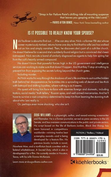 "Intense, compelling, and relentless . . . will keep you turning the pages until the very last one." -Mike McGrale, screenwriter, The Following, CSI: Miami "Strap in for Failure Point's chilling ride of mounting suspense that leaves you gasping at the ride's end." -Parris Afton Bonds, New York Times bestselling author Is it possible to really know your spouse? Nick Faulkner is about to find out . . . if he can stay alive. Nick-a former FBI star whose career mysteriously tanked, returns home one day to find that his wife Lexi has walked out on him and simply vanished. Then, he discovers she's part of a cult-like church. He doesn't believe for a second she's suddenly found religion but is convinced she's been kidnapped. Nick recruits a band of similarly disgraced ex-agents to help him spring her from the cult's heavily armed compound. He doesn't know that powerful forces high in the US government and intelligence services are working to make sure that doesn't happen. And that they'll stop at nothing to prevent him from exposing the secrets lurking beyond the church gates. Including murder. As Nick works his way through the shadows of Lexi's life and tries to sort out the hidden truth behind her disappearance, he tumbles into a sprawling web of deceit and lies thick with betrayal and shifting loyalties, where nothing is as it seems. His quest will bring him face-to-face with enemies foreign and domestic, including traitors, social media "truth tellers," Russian spies, and well-armed mercenaries. And he'll have to survive a vast conspiracy determined to keep him from learning the stunning truth about who Lexi really is. Or, perhaps even more shocking, who she isn't.
