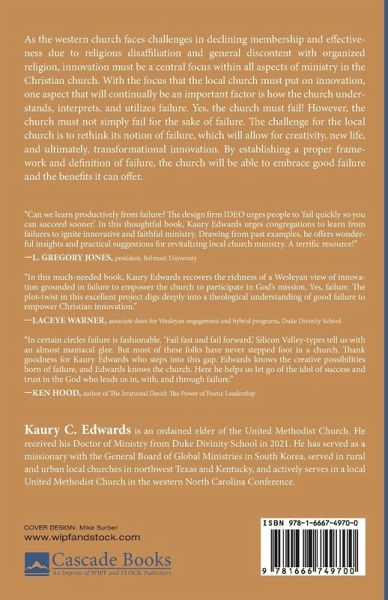 As the western church faces challenges in declining membership and effectiveness due to religious disaffiliation and general discontent with organized religion, innovation must be a central focus within all aspects of ministry in the Christian church. With the focus that the local church must put on innovation, one aspect that will continually be an important factor is how the church understands, interprets, and utilizes failure. Yes, the church must fail! However, the church must not simply fail for the sake of failure. The challenge for the local church is to rethink its notion of failure, which will allow for creativity, new life, and ultimately, transformational innovation. By establishing a proper framework and definition of failure, the church will be able to embrace good failure and the benefits it can offer.