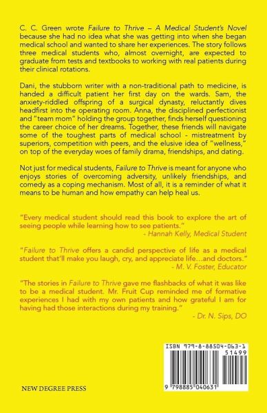 C. C. Green wrote Failure to Thrive - A Medical Student's Novel because she had no idea what she was getting into when she began medical school and wanted to share her experiences. The story follows three medical students who, almost overnight, are expected to graduate from tests and textbooks to working with real patients during their clinical rotations. Dani, the stubborn writer with a non-traditional path to medicine, is handed a difficult patient her first day on the wards. Sam, the anxiety-riddled offspring of a surgical dynasty, reluctantly dives headfirst into the operating room. Anna, the disciplined perfectionist and "team mom" holding the group together, finds herself questioning the career choice of her dreams. Together, these friends will navigate some of the toughest parts of medical school - mistreatment by superiors, competition with peers, and the elusive idea of "wellness," on top of the everyday woes of family drama, friendships, and dating. Not just for medical students, Failure to Thrive is meant for anyone who enjoys stories of overcoming adversity, unlikely friendships, and comedy as a coping mechanism. Most of all, it is a reminder of what it means to be human and how empathy can help heal us.