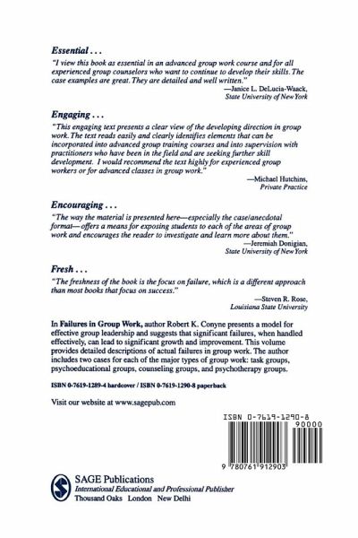 Actual failures in group work are examined in this book, as are the ways in which group leaders learnt from their mistakes, transforming failure into success. Two chapters are devoted to each major type of group work: task groups; psychoeducational groups; counselling groups; and psychotherapy groups. In each case study presented, Robert K Conyne covers the background, focuses on the group leadership functions of planning, performing and processing, and analyzes the major elements of the case.