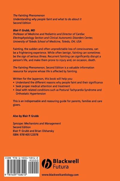 This book is packed with information in 'layman'sterms' - @we ordinary (non-medical) people' canthen start to understand different types of faints that are beingexperienced or witnessed. The book can get very technical in parts,but not overly, regarding the heart, brain and systems. TheFainting Phenomenon book by Blair Grub should be in every surgeryin the UK, it is a must that every Dr should have to hand. This isalso a very good book for anyone who faints, be they patient,parents or carers, it will set them off on the road to ask theright questions with medical people to obtain a diagnosis forfaints to put people (old or young) who suffer from this phenomenonat ease.