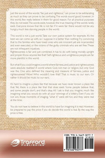 Just the sound of the words, "fair, just and righteous," can prove to be exhilarating as much as they can prove to be confusing. The words sound good, however; in this world, few really believe in them for good reason. For all practical purposes they do not exist. The words exist, however, the true meaning of the words rarely exist. Everyone knows that life is not fair. If it were fair there would not be any hungry, much less starving people in the world. This world is not a just world. Take our own justice system for example. It's the best we can come up with, so I suppose it is better than nothing. Try convincing that to the families who have loved ones who are innocent yet are incarcerated and even executed, or the victims of the guilty criminals who are set free. These are not infrequent injustices. Righteousness is fair and just combined. It has to do with being morally upright and proper. Know anyone like that? Self-righteous and unrighteous people are far more plentiful in this world. But what if you could imagine a world where fairness, and justice and righteousness were absolute realities? A world where God, not man or religion, but only God was the One who defined the meaning and measure of fairness, justice and righteousness? Wow! Who wouldn't love that? That is music to our ears. Or rather it should be music to our ears. It's hard to imagine a place like that because we have never known a place like that. Yet, there is a place like that that does exist. Some people believe that, and some people don't, and that's okay. All I ask is that you imagine, much like imagining what you would do with all your winnings of a lottery. Even if you do not win, those moments of imaging, "what if," were still fun, and they were real at the time. You do not have to believe in this world to have fun imagining it is real. However; be prepared to pay the price if you do decide this world is real. By the way, the price is free.
