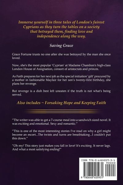 Fair Cyprians of London Immerse yourself in three tales of London's fairest Cyprians as they turn the tables on a society that betrayed them, finding love and independence along the way. Saving Grace Grace Fortune trusts no one after she was betrayed by the man she once loved. Now, she's the most popular 'Cyprian' at Madame Chambon's high-class London House of Assignation, consort of aristocrats and princes. As Faith prepares for her next job as the special initiation 'gift' procured by a mother in fashionable Mayfair for her son's twenty-first birthday, she plans her revenge. But revenge is a dish best left uneaten if the truth is not what's being served. Forsaking Hope Honour? Or her heart's desire? Two years ago, Felix Lord Durham believed that Hope, the vicar's beautiful daughter, had chosen to live in Germany as a governess rather than accept the marriage proposal he'd hinted at. Why else would she have failed to appear for their final secret assignation? Why else would Felix be given snippets about her new life on the Continent from various sources? Now the divine "Miss Hope" is in Felix's bed - a surprise gift from his friends designed to lift his spirits and sourced from London's most exclusive brothel, Madame Chambon's. Despite feeling betrayed, Felix can't bear to lose her again, but Hope Merriweather is bound to her new life by a dark secret. Having sacrificed the man she loves once already, she must choose again: Honour or her heart's desire? Keeping Faith Revenge is sweet until it breaks your heart. Falsely accused of stealing, Faith is given two choices: Fend for herself on the streets of London, or become indentured to Madame Chambon, the ruthless proprietor of London's most exclusive brothel. In order to survive, Faith submits to the machinations of a mysterious benefactress and begins a new life under Madame Chambon's roof. However, she does not live like the other girls. Rather, she's taught the theory of how to entrance London's noble gentlemen with her learning in philosophy, politics and art. Her body is to be saved for the greatest enticement of all: revenge. Faith doesn't care what she has to do. She lives only to fulfil a bargain that will set her free. But when Faith is recruited as the muse of a talented, sensitive painter whose victory in a prestigious art competition turns them both into celebrities overnight, she discovers the reasons behind her mission are very different from what she'd been led to believe. Now she is complicit in something dark and dangerous while riches, adulation and freedom are hers for the taking. But what value are these if her heart has become a slave to the honorable man she is required to destroy? "The writer was able to get a 7-course meal into a sandwich sized novel. It was exciting and emotional. Sexy and romantic." "This is one of the most interesting stories I've read on why a girl might become an escort..The twists and turns are breathtaking...I couldn't put this down." "Oh my! This story just makes you fall in love! It's exciting. It never lags. And what a most satisfying ending!"
