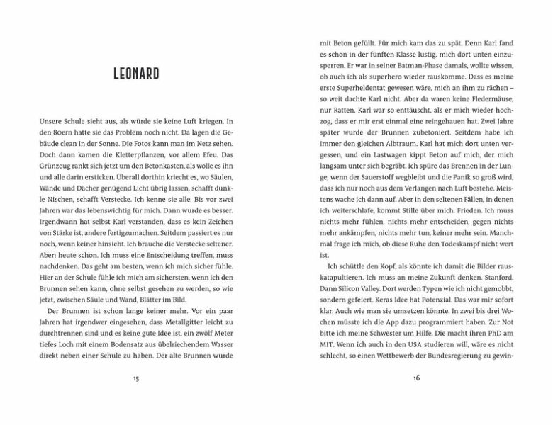 Opfer. Will man nicht bringen, will man nicht sein. Trotzdem haben wir nach den Sommerferien beschlossen, etwas zu opfern: unsere Freiheit. Zumindest für drei Monate. Wir kriegen etwas Besseres für das, was wir aufgeben, dachten wir. Da war das große Ziel, klar, das offizielle: die Welt retten, wenigstens ein bisschen. Vielleicht wäre das Experiment nicht außer Kontrolle geraten, wenn es dabei geblieben wäre. Aber jeder von uns hatte auch einen persönlichen Grund mitzumachen ... oder zu rebellieren: Status, Geld, Rache, Liebe.