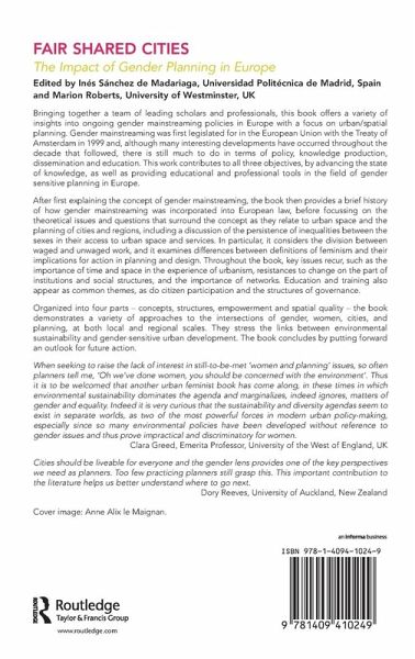 'When seeking to raise the lack of interest in still-to-be-met women and planning issues, so often planners tell me, Oh we've done women, you should be concerned with the environment. Thus it is to be welcomed that another urban feminist book has come along, in these times in which environmental sustainability dominates the agenda and marginalises, indeed ignores, matters of gender and equality. Indeed it is very curious that the sustainability and diversity agendas seem to exist in separate worlds, as two of the most powerful forces in modern urban policy-making, especially since so many environmental policies have been developed without reference to gender issues and thus prove impractical and discriminatory for women.' Clara Greed, Emerita Professor, University of the West of England, UK 'Cities should be liveable for everyone and the gender lens provides one of the key perspectives we need as planners. Too few practicing planners still grasp this. This important contribution to the literature helps us better understand where to go next.' Dory Reeves, University of Auckland, New Zealand 'The chapters are concise and specific, and its structure allows the editors to bring together a wide variety of research on an array of gender planning issues... the text is incredibly thought provoking and its varied contributions would suit a variety of educational contexts, from undergraduate and graduate courses on urban planning, gender and European politics to practitioners and policymakers.' LSE Review of Books 'Fair Shared Cities is an original edited collection featuring state-of-the-art conceptual treatises and rich empirical case studies on gender planning in diverse European urban contexts.' Environment and Planning B