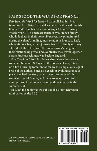Fair Stood the Wind for France, first published in 1944, is author H. E. Bates' fictional account of a downed English bomber-pilot and his crew over occupied France during World War II. The men are taken in by a French family who hide them in their home. However, the pilot, injured during the plane's landing, must remain in France to heal, while his crew begin their journey back to friendly territory. The pilot falls in love with the home-owner's daughter, their relationship grows and eventually they travel together across France, seeking a way back to England. Fair Stood the Wind for France rises above the average romance, however. Set against the horrors of war, it takes on a life-affirming force, enhanced by the simple, yet elegant prose of the author. Bates also excels at evoking a sense of place; much of the story occurs over the course of a hot summer in rural France, and there are many beautiful descriptions of the French countryside as it bakes in the summer heat. In 1980, the book was the subject of a 4-part television mini-series by the BBC.