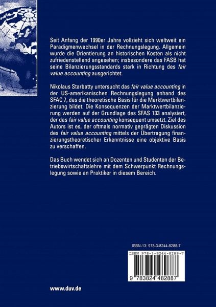 Nikolaus Starbatty untersucht das fair value accounting in der US-amerikanischen Rechnungslegung anhand des SFAC 7, das die theoretische Basis für die Marktwertbilanzierung bildet. Die Konsequenzen der Marktwertbilanzierung werden auf der Grundlage des SFAS 133 analysiert, der das fair value accounting konsequent umsetzt. Ziel des Autors ist es, der oftmals normativ geprägten Diskussion des fair value accounting mittels der Übertragung finanzierungstheoretischer Erkenntnisse eine objektive Basis zu verschaffen.