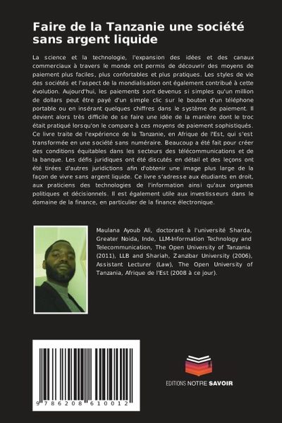 La science et la technologie, l'expansion des idées et des canaux commerciaux à travers le monde ont permis de découvrir des moyens de paiement plus faciles, plus confortables et plus pratiques. Les styles de vie des sociétés et l'aspect de la mondialisation ont également contribué à cette évolution. Aujourd'hui, les paiements sont devenus si simples qu'un million de dollars peut être payé d'un simple clic sur le bouton d'un téléphone portable ou en insérant quelques chiffres dans le système de paiement. Il devient alors très difficile de se faire une idée de la manière dont le troc était pratiqué lorsqu'on le compare à ces moyens de paiement sophistiqués. Ce livre traite de l'expérience de la Tanzanie, en Afrique de l'Est, qui s'est transformée en une société sans numéraire. Beaucoup a été fait pour créer des conditions équitables dans les secteurs des télécommunications et de la banque. Les défis juridiques ont été discutés en détail et des leçons ont été tirées d'autres juridictions afin d'obtenir une image plus large de la façon de vivre sans argent liquide. Ce livre s'adresse aux étudiants en droit, aux praticiens des technologies de l'information ainsi qu'aux organes politiques et décisionnels. Il est également utile aux investisseurs dans le domaine de la finance, en particulier de la finance électronique.
