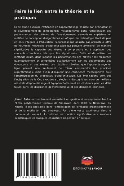 Cette étude examine l'efficacité de l'apprentissage assisté par ordinateur et le développement de compétences métacognitives dans l'amélioration des performances des élèves de l'enseignement secondaire supérieur en matière de conception d'algorithmes en Afrique. La technologie étant de plus en plus intégrée à l'éducation, l'apprentissage assisté par ordinateur offre de nouvelles méthodes d'apprentissage qui peuvent améliorer de manière significative la capacité des élèves à comprendre et à appliquer des concepts complexes tels que les algorithmes. Cette étude utilise une méthode mixte, dans laquelle les performances des élèves sont mesurées quantitativement et complétées qualitativement par les observations des éducateurs et des élèves. Les résultats révèlent que l'apprentissage en ligne permet non seulement de mieux comprendre les principes algorithmiques, mais aussi d'acquérir une conscience métacognitive pour l'autorégulation du processus d'apprentissage. Les implications sont que l'intégration de la CAL avec des stratégies métacognitives aura de meilleurs résultats d'apprentissage et équipera finalement les étudiants pour les défis futurs dans les disciplines de l'informatique et des domaines connexes.