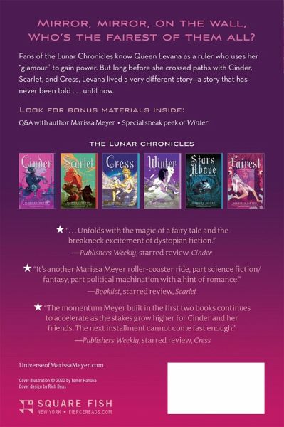 Prepare to see the New York Times-bestselling series like you've never seen it before, now with new cover art! A standalone prequel to the #1 New York Times- and USA Today-Bestselling Lunar Chronicles series by Marissa Meyer! Find out what made the evil space queen from the beloved series so wicked. "An interesting mash up of fairy tales and science fiction . . . a cross between Cinderella, Terminator, and Star Wars." -Entertainment Weekly "Prince Charming among the cyborgs." -The Wall Street Journal Mirror, mirror, on the wall. Who is the Fairest of them all? Pure evil has a name, hides behind a mask of deceit, and uses her "glamour" to gain power. But who is Queen Levana? Long before she crossed paths with Cinder, Scarlet, and Cress in The Lunar Chronicles, Levana lived a very different story-a story that has never been told . . . until now. New York Times-bestselling author Marissa Meyer reveals the story behind her fascinating villain in Fairest, an unforgettable tale about love and war, deceit and death. This extraordinary book includes a special full-color image of Levana's castle and an excerpt from Winter, the exciting conclusion to The Lunar Chronicles. Don't miss these other books from #1 New York Times- and USA Today -Bestselling author Marissa Meyer: The Lunar Chronicles: Cinder Scarlet Cress Winter Stars Above Fairest The Lunar Chronicles Coloring Book Wires and Nerve: Vol. 1 Wires and Nerve: Vol. 2 Renegades: Renegades: Book One Archenemies: Book Two Supernova: Book Three Heartless