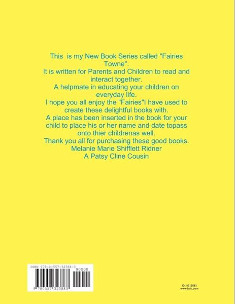 This is my introduction to my New Children's Books " Fairies Towne" Twelve Book Series. These books are fresh for children and the way they see and interact with the living world. They are a twelve book library of stories.I made these books for a Child's heart.It is filled with stories to help parents read and educate their children with many aspects of today's world.These books are created for parents and children to read and interact with each other.They have been a joy to write for me.I have also inserted a page in each book for your children to put their name and date when they received one so they may keep them as a keepsake for years to come and pass them down to their own children.I hope everyone enjoys them.From my heart to all parents and their children. God Bless All the little children. Melanie Marie Shifflett Ridner