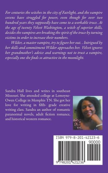 For centuries the witches in the city of Fairlight, and the vampire covens have struggled for power, even though for over two hundred years they supposedly have come to a workable truce. At the age of twenty Velvet Washington, a witch of superior skills, decides the vampires are breaking the spirit of the truce by turning victims in order to increase their numbers. Any witch, she believes, knows the power in numbers. Unfortunately, the Council doesn't care and insists she mind her own business and stop the night stalking in graveyards. However, Velvet thinks it is her duty to halt the monthly risings of the undead. Wilder, a master vampire, and his sired partner, Jerome, trail her for a few months trying to figure her out. She is a witch that seems as driven as a slayer. Slayers, who just happen not to reside in Fairlight anymore. Intrigued by her skills and commitment Wilder approaches her. Wilder has not lost any of his to her sword, so he can be generous enough to warn her to cease at once because the Coven as a whole, though reluctant to risk incident with the council, will get around to stopping her, and to Velvet the only way a vampire can make her stop anything is to kill her. Wilder finds her attitude ridiculous and tells her the folly of her single- minded prejudice and extreme arrogance. He tries to convey she is short sighted in what she can accomplish with her talents, and what she could do for Fairlight as a whole community, rather than just for witches. Velvet ignores her grandmother's advice and warnings not to trust a vampire, especially one she finds so attractive in the moonlight.