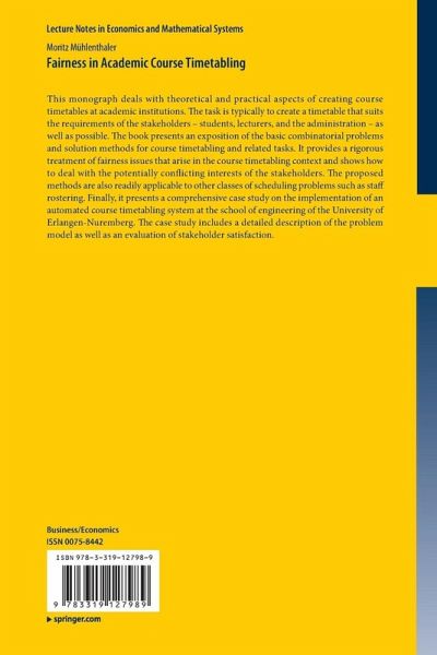 This monograph deals with theoretical and practical aspects of creating course timetables at academic institutions. The task is typically to create a timetable that suits the requirements of the stakeholders - students, lecturers, and the administration - as well as possible. The book presents an exposition of the basic combinatorial problems and solution methods for course timetabling and related tasks. It provides a rigorous treatment of fairness issues that arise in the course timetabling context and shows how to deal with the potentially conflicting interests of the stakeholders. The proposed methods are also readily applicable to other classes of scheduling problems such as staff rostering. Finally, it presents a comprehensive case study on the implementation of an automated course timetabling system at the school of engineering of the University of Erlangen-Nuremberg. The case study includes a detailed description of the problem model as well as an evaluation of stakeholdersatisfaction.