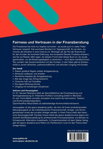 Dr. Dr. Hannes Peterreins ist Geschäftsführer der Finanz- und Vermögensberatung Dr. Peterreins Portfolio Consulting GmbH in München. Dr. phil. Doris Märtin schreibt, konzipiert und coacht als freie Autorin, Texterin und Kommunikationsberaterin. Ihre Kernkompetenz liegt in den Bereichen Unternehmenssprache und Potenzialentwicklung. Diplomkauffrau Maud Beetz ist selbstständige Kommunikationstrainerin. Schwerpunkte ihrer Tätigkeit ist die Beratung zu den Themen Etikette, Persönlichkeit und Kommunikation im Geschäftsleben.