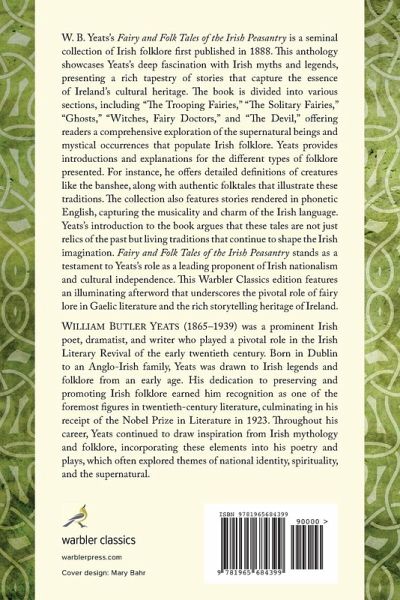 W. B. Yeats's Fairy and Folk Tales of the Irish Peasantry is a seminal collection of Irish folklore first published in 1888. This anthology showcases Yeats's deep fascination with Irish myths and legends, presenting a rich tapestry of stories that capture the essence of Ireland's cultural heritage. The book is divided into various sections, including "The Trooping Fairies," "The Solitary Fairies," "Ghosts," "Witches, Fairy Doctors," and "The Devil," offering readers a comprehensive exploration of the supernatural beings and mystical occurrences that populate Irish folklore. Yeats provides introductions and explanations for the different types of folklore presented. For instance, he offers detailed definitions of creatures like the banshee, along with authentic folktales that illustrate these traditions. The collection also features stories rendered in phonetic English, capturing the musicality and charm of the Irish language. Yeats's introduction to the book argues that these tales are not just relics of the past but living traditions that continue to shape the Irish imagination. Fairy and Folk Tales of the Irish Peasantry stands as a testament to Yeats's role as a leading proponent of Irish nationalism and cultural independence. This Warbler Classics Edition features an illuminating afterword that underscores the pivotal role of fairy lore in Gaelic literature and the rich storytelling heritage of Ireland.