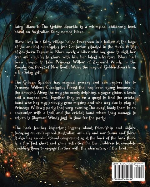 Magic, Adventure, and Nature: A Fairy Tale That Encourages Kids to Love and Protect the Environment! Deep in the heart of the Australian bush, Blaze-a daring little fairy-is entrusted with an extraordinary mission. She must deliver the magical Golden Sparkle to Princess Willow, a gift with the power to save the eucalyptus forest and protect its precious wildlife. Along her journey, Blaze encounters unique Australian animals, faces exciting challenges, and discovers the true meaning of courage, friendship, and the magic of nature. Fairy Blaze and the Golden Sparkle is a beautifully illustrated short chapter book for readers aged 7 to 10. Combining an engaging story with interactive activities, this book inspires children to explore themes of conservation, bravery, and teamwork while celebrating the wonders of Australia's wildlife. What makes this book special:Educational Value: Includes a fun facts sheet about Australian wildlife, making it perfect for classrooms and libraries. Interactive Features: Features a maze, crossword puzzle, word search, and word scramble to enhance learning and engagement. Environmental Themes: Highlights the importance of protecting Australia's unique ecosystems and animals. A Perfect first chapter book: Short chapters and vibrant illustrations make it ideal for young readers transitioning to chapter books. Whether for bedtime reading, classroom discussions, or library shelves, Fairy Blaze and the Golden Sparkle is a magical tale that inspires curiosity, empathy, and a love for nature.