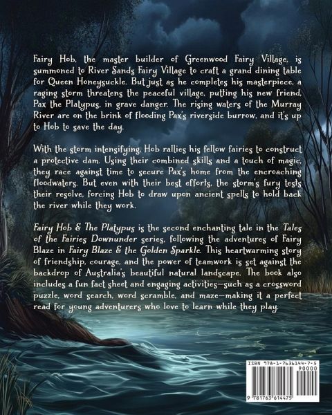 Fairy Hob & The Platypus Book 2 in the Tales of the Fairies Downunder series Deep in the enchanting Greenwood Fairy Village, Fairy Hob, the beloved builder and carpenter, is always ready to lend a helping hand. When Queen Honeysuckle requests a grand dining table for a royal feast, Hob embarks on a journey to River Sands Fairy Village. But as dark clouds gather, an unexpected encounter with a platypus named Pax leads him on a mission far more urgent than crafting furniture. As a raging storm threatens to flood the river, Pax's burrow is in grave danger. With time running out, Hob and his fairy friends must use their skills, courage, and a little fairy magic to save Pax's home before it's too late. Along the way, Hob discovers the true meaning of friendship and the importance of working together to protect the natural world. Fairy Hob & The Platypus is the second enchanting book in the Tales of the Fairies Downunder series, following Fairy Blaze & The Golden Sparkle. Brimming with adventure, wonder, and the magic of the Australian bush, this heartwarming tale celebrates kindness, teamwork, and the beauty of nature. ¿¿¿¿ Featuring beautiful, full-colour illustrations that bring the fairies and Australian wildlife to life! ¿¿¿¿ Includes fun activities and an interactive hidden key search for children!