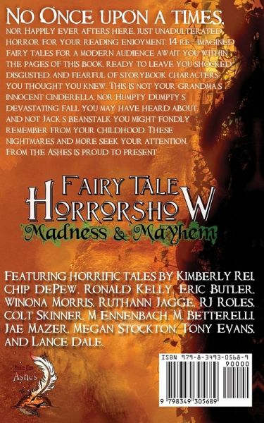 No Once upon a times, nor Happily ever afters here, just unadulterated horror for your reading enjoyment. 14 reimagined fairy tales for a modern audience await you within the pages of this book, ready to leave you shocked, disgusted, and fearful of storybook characters you thought you knew. This is not your grandma's innocent Cinderella, nor Humpty Dumpty's devastating fall you may have heard about, and not Jack's beanstalk you might fondly remember from your childhood. These nightmares and more seek your attention, and From the Ashes is proud to present: Fairy Tale Horrorshow 2: Madness & Mayhem Featuring horrific tales by Kimberly Rei, Chip DePew, Ronald Kelly, Eric Butler, Winona Morris, Ruthann Jagge, RJ Roles, Colt Skinner, M Ennenbach, M. Betterelli, Jae Mazer, Megan Stockton, Tony Evans, and Lance Dale.