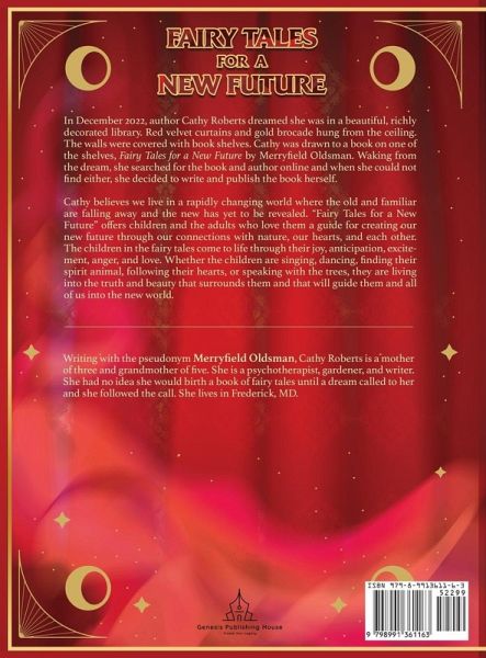 FAIRY TALES FOR A NEW FUTURE In December 2022, author Cathy Roberts dreamed she was in a beautiful, richly decorated library. Red velvet curtains and gold brocade hung from the ceiling. The walls were covered with book shelves. Cathy was drawn to a book on one of the shelves, Fairy Tales for a New Future by Merryfield Oldsman. Waking from the dream, she searched for the book and author online and when she could not find either, she decided to write and publish the book herself. Cathy believes we live in a rapidly changing world where the old and familiar are falling away and the new has yet to be revealed. "Fairy Tales for a New Future" offers children and the adults who love them a guide for creating our new future through our connections with nature, our hearts, and each other. The children in the fairy tales come to life through their joy, anticipation, excitement, anger, and love. Whether the children are singing, dancing, finding their spirit animal, following their hearts, or speaking with the trees, they are living into the truth and beauty that surrounds them and that will guide them and all of us into the new world. Writing with the pseudonym Merryfield Oldsman, Cath Roberts is a mother of three and grandmother of five. She is a psychotherapist, gardener, and writer. She had no idea she would birth a book of fairy tales until a dream called to her and she followed the call. She lives in Frederick, MD.