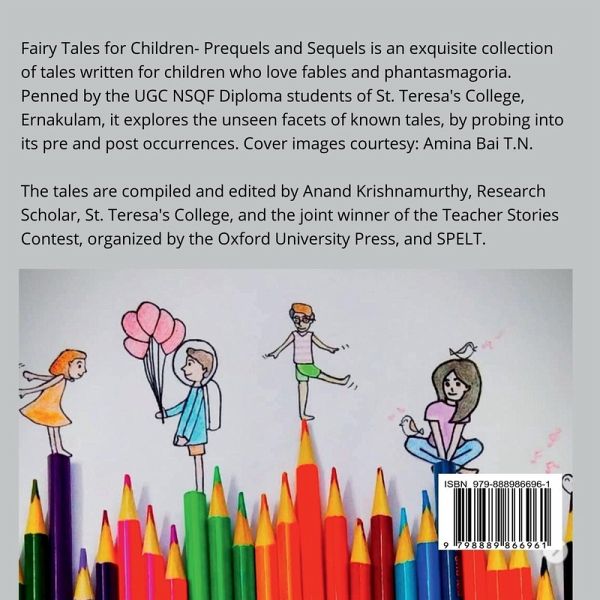 "Fairy Tales for Children- Prequels and Sequels" is an exquisite collection of tales written for children who love fables and phantasmagoria. Fairy Tales has always fascinated children and adults alike. The collection includes 20 prequels/seques to popular fairy tales, penned by the Diploma Students of St. Teresa's College, Ernakulam, and edited by Anand Krishnamurthy, winner of Teacher Stories Contest by Oxford University Press and SPELT.