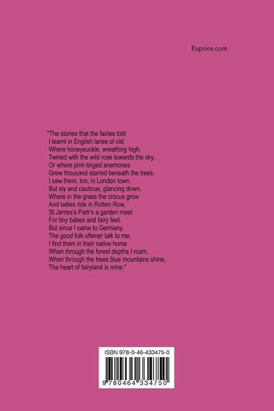 "The stories that the fairies told I learnt in English lanes of old, Where honeysuckle, wreathing high, Twined with the wild rose towards the sky, Or where pink-tinged anemones Grew thousand starred beneath the trees. I saw them, too, in London town, But sly and cautious, glancing down, Where in the grass the crocus grow And ladies ride in Rotten Row, St James's Park's a garden meet For tiny babes and fairy feet. But since I came to Germany, The good folk oftener talk to me; I find them in their native home When through the forest depths I roam, When through the trees blue mountains shine, The heart of fairyland is mine."