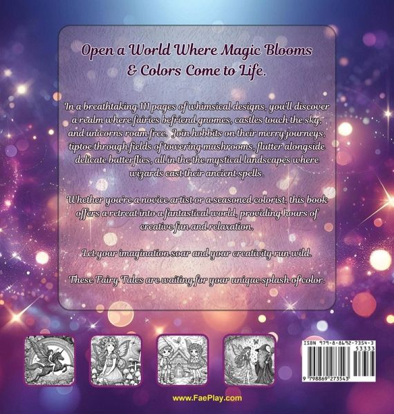 Open a World Where Magic Blooms & Colors Come to Life. www.FaePlay.com In a breathtaking 111 pages of whimsical designs, you'll discover a realm where fairies befriend gnomes, castles touch the sky, and unicorns roam free. Join hobbits on their merry journeys, tiptoe through fields of towering mushrooms, flutter alongside delicate butterflies, all in the the mystical landscapes where wizards cast their ancient spells. Whether you're a novice artist or a seasoned colorist, this book offers a retreat into a fantastical world, providing hours of creative fun and relaxation. Let your imagination soar and your creativity run wild. These Fairy Tales are waiting for your unique splash of color.