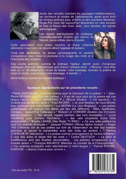 Après des recueils chantant les paysages méditerranéens, les bonheurs et doutes de l'adolescence, après avoir écrit de tendres poèmes pour enfants et des saynètes libertines, Roger-Pol nous fait aujourd'hui descendre en vers simples et frais le fleuve des mois, avec, pour escales, les signes astrologiques.Les signes astrologiques, le zodiaque, merveilleusement illustrés par Léonie Di Manno, jeune artiste pleine d'avenir.Cette association d'un poète reconnu et d'une créatrice débutante nous livre une oeuvre alliant sagesse et audace.Voilà la déclinaison du temps qu'enseignants et parents s'empareront pour initier la jeunesse à la magie des mots et à l'harmonie des couleurs.Ces courts poèmes, comme le pratique l'auteur, seront aussi d'originaux messages d'accueil téléphonique que chacun utilisera ainsi : « Bonjour, vous êtes bien au (n° de téléphone). Avant de laisser votre message, écoutez le poème de (nom du mois), puis laissez votre message. A bientôt. »