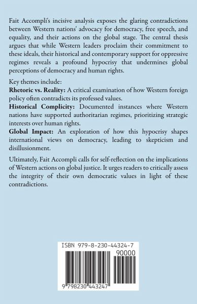Fait Accompli's incisive analysis exposes the glaring contradictions between Western nations' advocacy for democracy, free speech, and equality, and their actions on the global stage. The central thesis argues that while Western leaders proclaim their commitment to these ideals, their historical and contemporary support for oppressive regimes reveals a profound hypocrisy that undermines global perceptions of democracy and human rights. Key themes include: Rhetoric vs. Reality: A critical examination of how Western foreign policy often contradicts its professed values. Historical Complicity: Documented instances where Western nations have supported authoritarian regimes, prioritizing strategic interests over human rights. Global Impact: An exploration of how this hypocrisy shapes international views on democracy, leading to skepticism and disillusionment. Ultimately, Fait Accompli calls for self-reflection on the implications of Western actions on global justice. It urges readers to critically assess the integrity of their own democratic values in light of these contradictions.