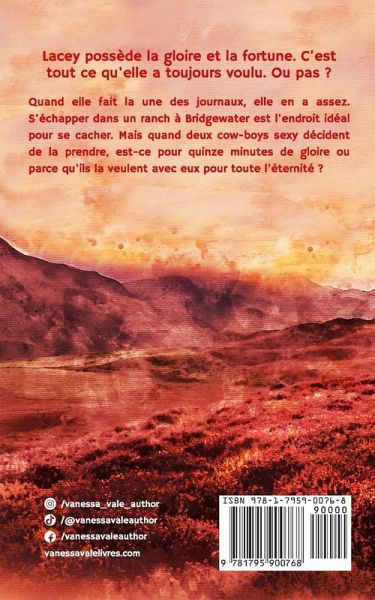 Lacey possède la gloire et la fortune. C'est tout ce qu'elle a toujours voulu. Ou pas ? Quand elle fait la une des journaux, elle en a assez. S'échapper dans un ranch à Bridgewater est l'endroit idéal pour se cacher. Mais quand deux cow-boys sexy décident de la prendre, est-ce pour quinze minutes de gloire ou parce qu'ils la veulent avec eux pour toute l'éternité ? Avertissement : chaud devant ! Faites-moi vôtre est une romance follement salace avec une héroïne vedette de cinéma qui veut se cacher du monde et deux cow-boys alpha obsédés qui la retrouvent. Pour la réclamer. Et pour qu’elle soit à eux. Cette histoire ne concerne qu’elle. Pas de scène mâle / mâle.