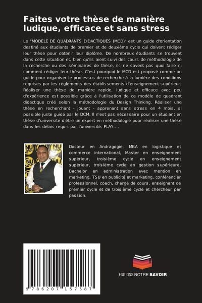 Le "MODÈLE DE QUADRANTS DIDACTIQUES (MCD)" est un guide d'orientation destiné aux étudiants de premier et de deuxième cycle qui doivent rédiger leur thèse pour obtenir leur diplôme. De nombreux étudiants se trouvent dans cette situation et, bien qu'ils aient suivi des cours de méthodologie de la recherche ou des séminaires de thèse, ils ne savent pas quoi faire ni comment rédiger leur thèse. C'est pourquoi le MCD est proposé comme un guide pour organiser le processus de recherche à la lumière des conditions requises par les règlements des établissements d'enseignement supérieur. Réaliser une thèse de manière rapide, ludique et efficace avec peu d'expérience est possible grâce à l'utilisation de ce modèle de quadrant didactique créé selon la méthodologie du Design Thinking. Réaliser une thèse en recherchant - jouant - apprenant sans stress en 4 mois, si possible juste guidé par le DCM. Il n'est pas nécessaire pour un étudiant en thèse d'université d'être un expert en méthodologie pour réaliser une thèse dans les délais requis par l'université. PLAY....