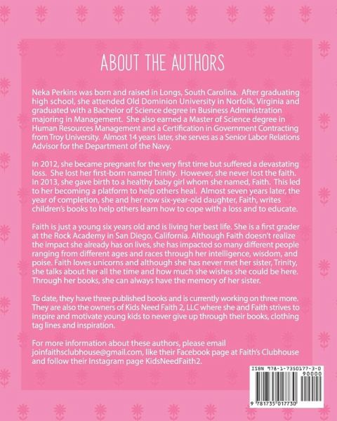 Neka Perkins was born and raised in Longs, South Carolina. After graduating high school, she attended Old Dominion University in Norfolk, Virginia and graduated with a Bachelor of Science degree in Business Administration majoring in Management. She also earned a Master of Science degree in Human Resources Management and a Certification in Government Contracting from Troy University. Almost 14 years later, she serves as a Senior Labor Relations Advisor for the Department of the Navy. In 2012, she became pregnant for the very first time but suffered a devastating loss. She lost her first-born named Trinity. However, she never lost the faith. In 2013, she gave birth to a healthy baby girl whom she named, Faith. This led to her becoming a platform to help others heal. Almost seven years later, the year of completion, she and her now six-year-old daughter, Faith, writes children's books to help others learn how to cope with a loss and to educate. To date, they have three published books and is currently working on three more. They are also the owners of Kids Need Faith 2, LLC where she and Faith strives to inspire and motivate young kids to never give up through their books, clothing tag lines and inspiration. Faith is just a young six years old and is living her best life. She is a first grader at the Rock Academy in San Diego, California. Although Faith doesn't realize the impact she already has on lives, she has impacted so many different people ranging from different ages and races through her intelligence, wisdom, and poise. Faith loves unicorns and although she has never met her sister, Trinity, she talks about her all the time and how much she wishes she could be here. Through her books, she can always have the memory of her sister. For more information about these authors, please email joinfaithsclubhouse@gmail.com, like their Facebook page at Faith's Clubhouse and follow their Instagram page KidsNeedFaith2.