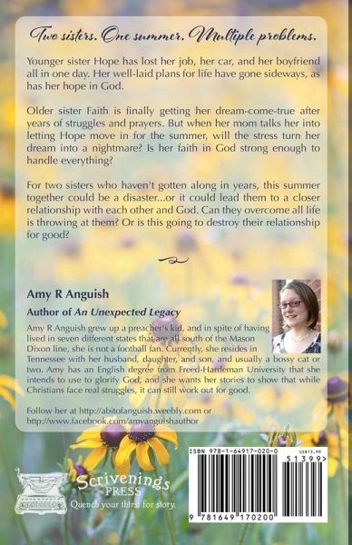 Hope needs more hope. Faith needs more faith. They both need a whole lot of love. Two sisters. One summer. Multiple problems. Younger sister Hope has lost her job, her car, and her boyfriend all in one day. Her well-laid plans for life have gone sideways, as has her hope in God. Older sister Faith is finally getting her dream-come-true after years of struggles and prayers. But when her mom talks her into letting Hope move in for the summer, will the stress turn her dream into a nightmare? Is her faith in God strong enough to handle everything? For two sisters who haven't gotten along in years, this summer together could be a disaster, or it could lead them to a closer relationship with each other and God. Can they overcome all life is throwing at them? Or is this going to destroy their relationship for good?