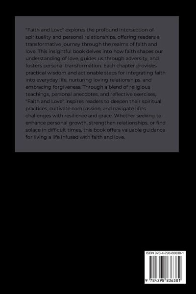 "Faith and Love" explores the profound intersection of spirituality and personal relationships, offering readers a transformative journey through the realms of faith and love. This insightful book delves into how faith shapes our understanding of love, guides us through adversity, and fosters personal transformation. Each chapter provides practical wisdom and actionable steps for integrating faith into everyday life, nurturing loving relationships, and embracing forgiveness. Through a blend of religious teachings, personal anecdotes, and reflective exercises, "Faith and Love" inspires readers to deepen their spiritual practices, cultivate compassion, and navigate life's challenges with resilience and grace. Whether seeking to enhance personal growth, strengthen relationships, or find solace in difficult times, this book offers valuable guidance for living a life infused with faith and love.