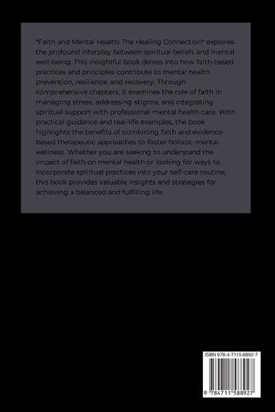 Faith and Mental Health: The Healing Connection explores the profound interplay between spiritual beliefs and mental well-being. This insightful book delves into how faith-based practices and principles contribute to mental health prevention, resilience, and recovery. Through comprehensive chapters, it examines the role of faith in managing stress, addressing stigma, and integrating spiritual support with professional mental health care. With practical guidance and real-life examples, the book highlights the benefits of combining faith and evidence-based therapeutic approaches to foster holistic mental wellness. Whether you are seeking to understand the impact of faith on mental health or looking for ways to incorporate spiritual practices into your self-care routine, this book provides valuable insights and strategies for achieving a balanced and fulfilling life.