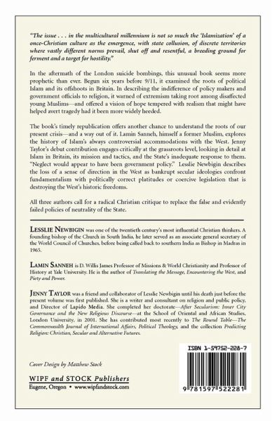 ""The issue . . . in the multicultural millennium is not so much the 'Islamization' of a once-Christian culture as the emergence, with state collusion, of discrete territories where vastly different norms prevail, shut off and resentful, a breeding ground for ferment and a target for hostility."" In the aftermath of the London suicide bombings, this unusual book seems more prophetic than ever. Begun six years before 9/11, it examined the roots of political Islam and its offshoots in Britain. In describing the indifference of policy makers and government officials to religion, it warned of extremism taking root among disaffected young Muslims -- and offered a vision of hope tempered with realism that might have helped avert tragedy had it been more widely heeded. The book's timely republication offers another -- and a way out of it. Lamin Sanneh, himself a former Muslim, explores the history of Islam's always controversial accommodations with the West. Jenny Taylor's debut engages contribution critically at the grassroots level, looking in detail at Islam in Britain, its mission and tactics, and the State's inadequate response to them. ""Neglect would appear to have been government policy."" Lesslie Newbigin describes the loss of a sense of direction in the West as bankrupt secular ideologies confront fundamentalism with politically correct platitudes or coercive legislation that is destroying the West's historic freedoms. All three authors call for a radical Christian critique to replace the false and evidently failed policies of neutrality of the State.