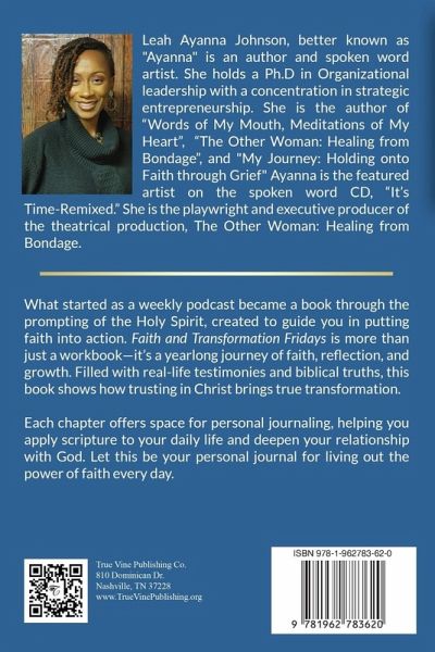 What began as a weekly podcast evolved into a transformative book, inspired by the Holy Spirit, to help you put faith into action. Faith and Transformation Fridays is more than a workbook-it's a yearlong journey of spiritual growth, reflection, and renewal. Packed with real-life testimonies and biblical truths, this book demonstrates how trusting in Christ leads to true transformation. Each chapter provides space for personal journaling, encouraging you to apply scripture to your daily life and strengthen your walk with God. Whether you're seeking encouragement, deeper faith, or a closer relationship with God, this book serves as your personal guide to living out faith every day. Let it inspire you to take intentional steps toward spiritual growth and embrace the power of faith in action. Are you ready for a year of transformation? Let your journey begin today.