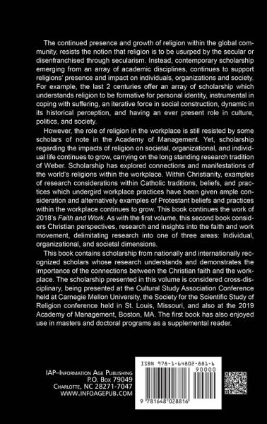 The continued presence and growth of religion within the global community, resists the notion that religion is to be usurped by the secular or disenfranchised through secularism. Instead, contemporary scholarship emerging from an array of academic disciplines, continues to support religions' presence and impact on individuals, organizations and society. For example, the last two centuries offer an array of scholarship which understands religion to be formative for personal identity, instrumental in coping with suffering, an iterative force in social construction, dynamic in its historical perception and having an ever present role in culture, politics and society. However, the role of religion in the workplace is still resisted by some scholars of note in the Academy of Management. Yet, scholarship regarding the impacts of religion on societal, organizational and individual life continues to grow, carrying on the long standing research tradition of Weber. Scholarship has explored connections and manifestations of the world's religions within the workplace. Within Christianity, examples of research considerations within Catholic traditions, beliefs and practices which undergird workplace practices have been given ample consideration and alternatively examples of Protestant beliefs and practices within the workplace continues to grow. This second volume continues the work of the first volume of Faith and Work, Christian Perspectives, published in 2018. As with the first volume, this second volume considers Christian perspectives, research and insights into the faith and work movement, delimitating research into one of three areas: Individual, organizational and societal dimensions. This book contains scholarship from nationally and internationally recognized scholars whose research understands and demonstrates the importance of the connections between the Christian faith and the workplace. The scholarship presented in this volume is considered cross disciplinary, as was the first volume which was presented at the Cultural Study Association (CSA) Conference held at Carnegie Mellon University, the Society for the Scientific Study of Religion (SSSR) conference held in St. Louis, Missouri and also at the 2019 Academy of Management, Boston, MA. The first book has also enjoyed use in masters and doctoral programs as a supplemental reader.